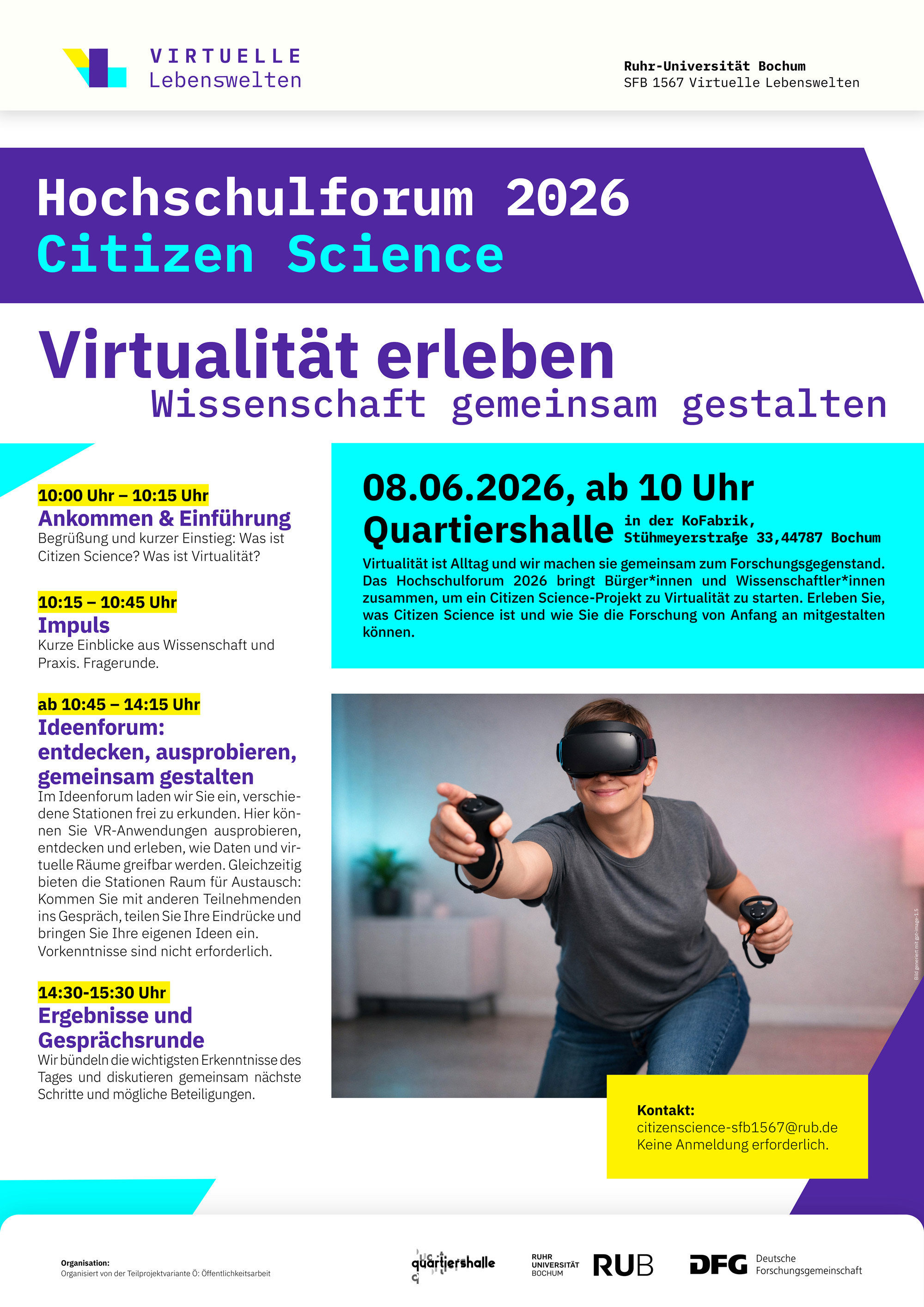 Virtualität ist Alltag und wir machen sie gemeinsam zum Forschungsgegenstand. Das Hochschulforum 2026 bringt Bürger*innen und Wissenschaftler*innen zusammen, um ein Citizen Science-Projekt zu Virtualität zu starten. Erleben Sie, was Citizen Science ist und wie Sie die Forschung von Anfang an mitgestalten können. Die Veranstaltung findet am 8. Juni 2026 in der Quartiershalle, Stühmeyerstraße 33 in Bochum statt. Eine Anmeldung ist nicht erforderlich.