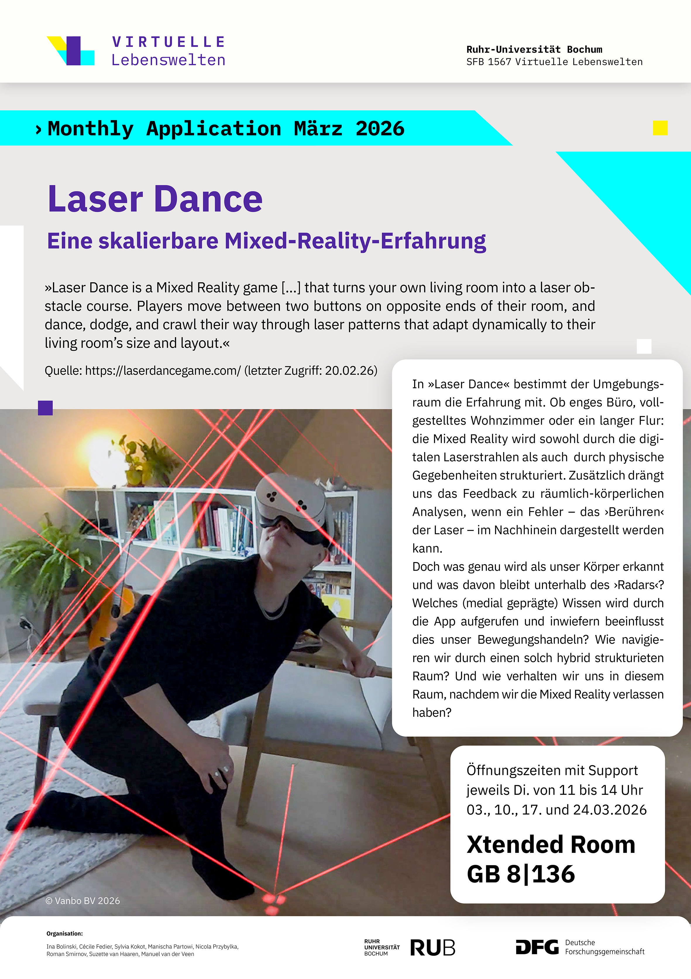 »Laser Dance« macht den Umgebungsraum zum aktiven Bestandteil der Mixed Reality-Erfahrung. Digitale Laserstrahlen und physische Gegebenheiten verschränken sich zu einem hybriden Spielfeld, das zur räumlich-körperlichen Analyse einlädt. Die Anwendung wirft Fragen auf: Was wird als Körper erkannt, was bleibt unsichtbar? Welches Wissen über Bewegung und Raum wird durch die App aktiviert – und wie beeinflusst das unser Handeln? »Laser Dance« fordert dazu heraus, die eigene Navigation durch virtuelle und reale Strukturen zu reflektieren und das eigene Verhalten auch nach Verlassen der Mixed Reality neu zu betrachten. Öffnungszeiten mit Support sind am 03., 10., 17. und 24. März 2026 von 11 bis 14 Uhr im XR (GB 8|136).