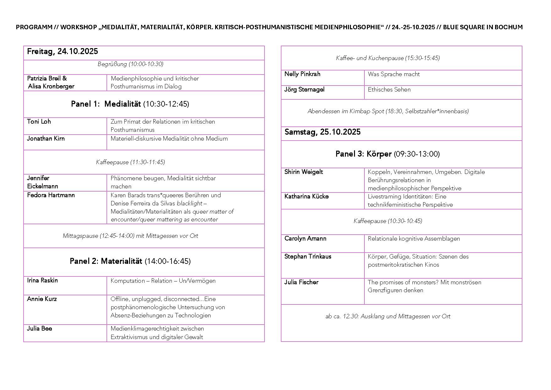 Der Workshop entwickelt eine kritisch-posthumanistische Medienphilosophie, die Relationalität als zentrale Kategorie dynamischer Mensch-Technik-Verhältnisse etabliert. Mit der theoretischen Dezentralisierung des Menschen richtet sich der analytische Fokus auf die Zwischenräume medialer Gefüge. Drei konzeptuelle Schwerpunkte strukturieren den Dialog: Medialität als performative Wirkmacht, verbunden mit Karen Barads Konzept der »dynamischen Un/Bestimmtheit« und der Frage nach agentiell-realistischen Ein- und Ausschlussmechanismen. Materialität jenseits von Interface-Design, verstanden als agentiell (Barad), lebendig (Bennett) oder sensibel (Kirby) sowie Körper als verkörperte Berührungsrelationen in digitaler Medialität, die mit Donna Haraways monströsem Körper als von algorithmischen Macht- und Herrschaftsstrukturen durchzogen analysiert werden.